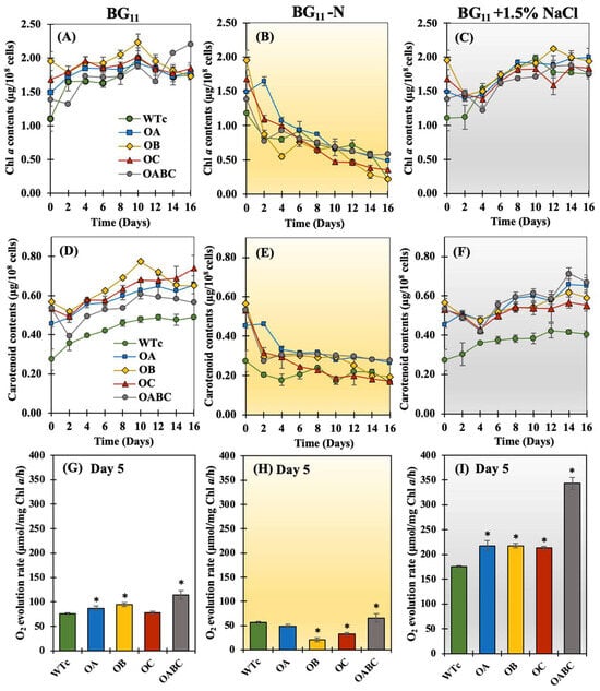 The chlorophyll a contents of overexpressing strains were comparable to those of the wild-type control in all media studied (Figure 4A–C). In contrast, a certain increase in carotenoids’ accumulation occurred in overexpressing strains, which was higher than the wild-type control (WTc) under all conditions, in particular OA and OABC in BG11-N and BG11+1.5% NaCl media (Figure 4D–F). Additionally, overexpressing strains growing at log phase showed greater O2 evolution rates than WTc, representing cyanobacterial photosynthetic efficiency, except for the OC strain under normal BG11 condition (Figure 4G). It appears that the salt stress in creased all strains’ photosynthetic efficiency, especially the OABC strain (Figure 4I). Conversely, in the nitrogen-starved condition, photosynthetic efficiency was significantly reduced (Figure 4H).
