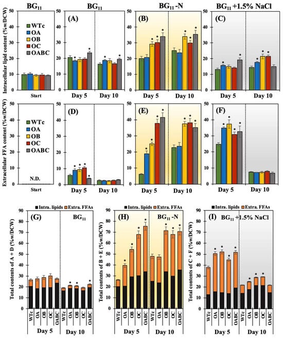 Contents of intracellular lipids (A–C), extracellular FFAs (D–F), and total contents of intracellular lipids and extracellular FFAs (G–I) of Synechocystis WTc, OA, OB, OC, and OABC strains cultured under normal BG11 (A,D,G), BG11-N (B,E,H), and BG11+1.5% NaCl (C,F,I) conditions at days 5 and 10 of treatment. The error bars represent standard deviations of means (mean ± S.D., n = 3). The statistical difference (Student’s t-test) between the values of WTc and the engineered strain is represented by an asterisk, * p < 0.05.