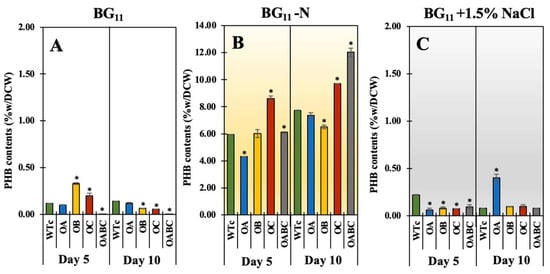 Contents of polyhydroxybutyrate (PHB) in of Synechocystis sp. PCC 6803 WTc, OA, OB, OC, and OABC strains cultured under normal BG11 (A), BG11-N (B), and BG11+1.5% NaCl (C) conditions at days 5 and 10 of treatment. The error bars represent standard deviations of means (mean ± S.D., n = 3). The statistical difference (Student’s t-test) between the values of WTc and the engineered strain is represented by an asterisk, * p < 0.05.