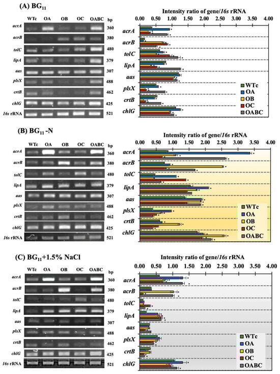 Transcript levels of acrA, acrN, tolC, lipA, aas, plsX, crtB, and chlG genes and their relative intensity ratios of each gene/16s rRNA of Synechocystis sp. PCC 6803 WTc, OA, OB, OC, and OABC strains cultured at day 5 of treatment under normal BG11 (A), BG11-N (B), and BG11+1.5% NaCl (C) conditions. The error bars represent standard deviations of means (mean ± S.D., n = 3). The statistical difference (Student’s t-test) between the values of WTc and the engineered strain is represented by an asterisk, * p < 0.05. The original images of RT-PCR products on a 1.5% agarose gel were shown in Supplementary Information Figures S1–S3.