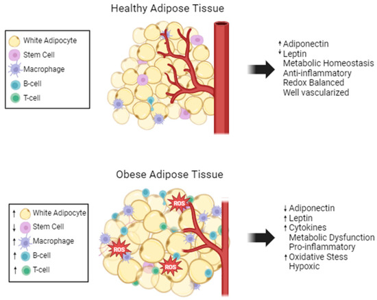 Adipose tissue composition changes with obesity. Healthy adipose tissue is well maintained and regulated. Stem cells and a few anti-inflammatory immune cells are present. Obese adipose tissue has fewer mature adipocytes, but the adipocytes are larger in size. There is excess ROS and limited vascularization in obese adipose tissue. Many pro-inflammatory cells are present, and the metabolism and cytokine secretions are dysregulated, increased (↑) and decreased (↓).