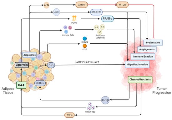 Adipose tissue and cancer are in constant crosstalk with one another. Adiponectin secreted by adipose tissue inhibits mTOR and in turn blocks proliferation, while leptin activates the JAK-STAT pathway to promote proliferation. Adipose tissue undergoes lipolysis secreting fatty acids that activate PPAR-γ, initiating angiogenesis in tumor cells. Immune cells from adipose tissue secrete pro-tumor factors aiding the tumor in evading the immune system. Adipose tissue also secretes cytokines such as CXCL12 and CCL7 to induce prostate cancer cell migration. Prostate cancer also releases cytokines such as IL-1B, which activates COX-2 and PGE2. PGE2 then cycles back to the tumor to promote migration and invasion through the cAMP-PKA/PI3K/AKT pathway. MiRNA-130 and TNF-α from cancer cells promote the dedifferentiation of adipocytes into cancer-associated adipocytes (CAAs). CAAs undergo enhanced lipolysis, feeding the cancer cells fatty acids.