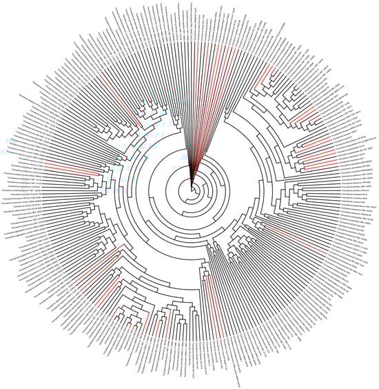 - Kozlov, A.M.; Darriba, D.; Flouri, T.; Morel, B.; Stamatakis, A. RAxML-NG: A fast, scalable and user-friendly tool for maximum likelihood phylogenetic inference. Bioinformatics 2019, 35, 4453–4455. [Google Scholar] [CrossRef] [PubMed]