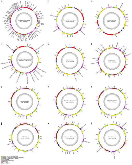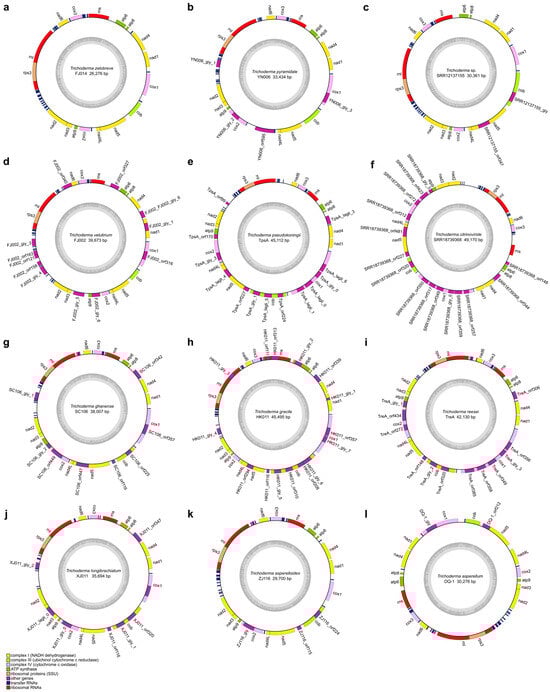 Mitogenome map of T. zelobreve FJ014 (a), T. pyramidale YN006 (b), Trichoderma sp. SRR12137155 (c), T. velutinum FJ002 (d), T. pseudokoningii TpsA (e), T. citrinoviride SRR18739368 (f), T. ghanense SC106 (g), T. gracile HK011 (h), T. reesei TreA (i), T. longibrachiatum XJ011 (j), T. asperelloides ZJ116 (k), and T. asperellum DQ-1 (l).
