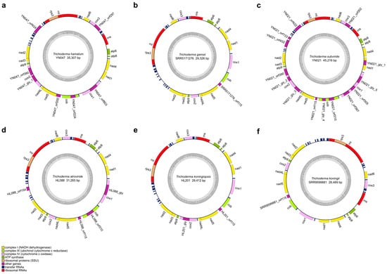 Mitogenome map of T. hamatum YN047 (a), T. gamsii SRR5171276 (b), T. subviride YN021 (c), T. atroviride HL088 (d), T. koningiopsis HL201 (e), and T. koningii SRR9599881 (f).