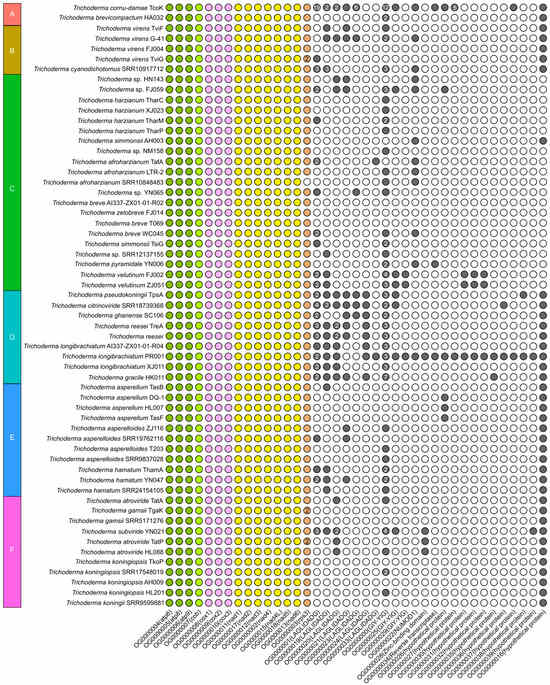 Comparative analysis of homologous gene families in the Trichoderma mitogenomes. The color-filled circle represents the presence of homologous genes, and the number represents the number of homologous genes. Blocks A–F were identified by phylogenetic relationships of Trichoderma species.