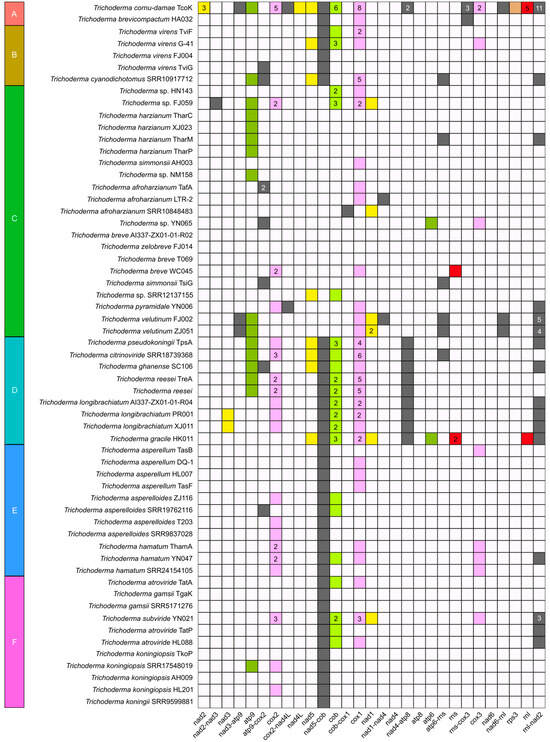 Comparative analysis of intron in the Trichoderma mitogenomes. The genes are presented in order of their position in the genome below the squares. The color-filled square represents the presence of intron in the gene or intergenic region, and the number represents the number of intron. Blocks A–F were identified by phylogenetic relationships of Trichoderma species.