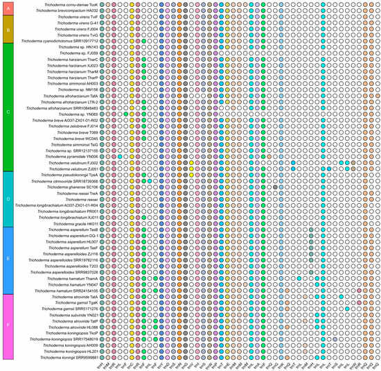 Comparative analysis of tRNA in the Trichoderma mitogenomes. The tRNAs are presented in order of their position in the genome below the circles. The color-filled circle represents the presence of the tRNA. Blocks A–F were identified by phylogenetic relationships of Trichoderma species.