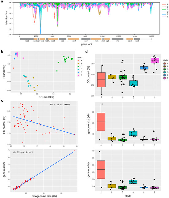 The principal component analysis supported the divergence of the six major branches of these mitogenomes (Figure 9b). Clustered mitogenomes from the six branches were clearly identified. The two strains from the early divergent branch A were located between strains from branches D and E. The strains from branches B, C, and D were separated. The strains from branches E and F were close to each other, which is consistent with their recent divergence in phylogeny.
