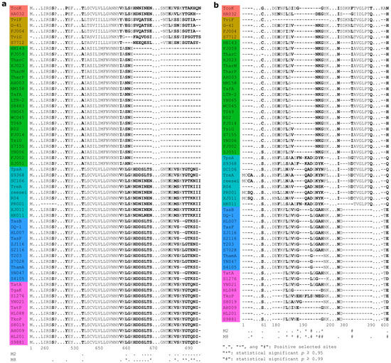 - Edgar, R.C. MUSCLE: Multiple sequence alignment with high accuracy and high throughput. Nucleic Acids Res. 2004, 32, 1792–1797. [Google Scholar] [CrossRef]