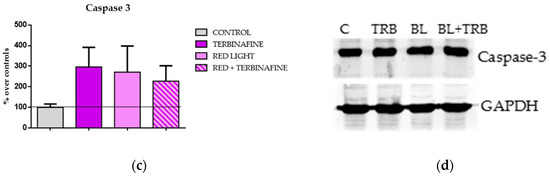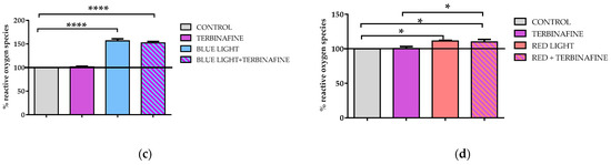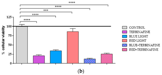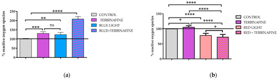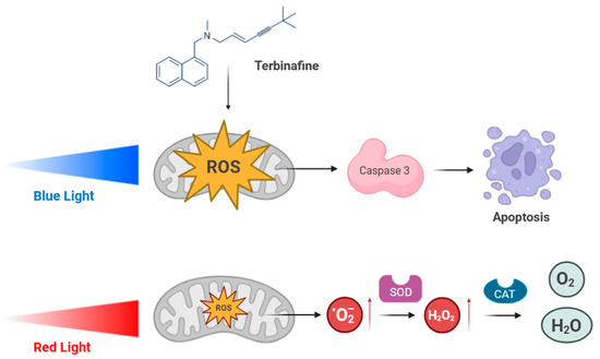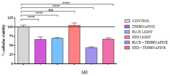 Pérez González, L.A.; Martínez-Pascual, M.A.; Toledano-Macías, E.; Jara-Laguna, R.C.; Fernández-Guarino, M.; Hernández-Bule, M.L. Effect of Combination of Blue and Red Light with Terbinafine on Cell Viability and Reactive Oxygen Species in Human Keratinocytes: Potential Implications for Cutaneous Mycosis. Int. J. Mol. Sci. 2024, 25, 12145. https://doi.org/10.3390/ijms252212145