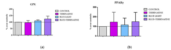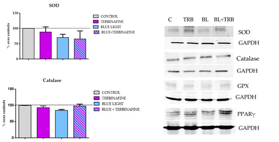 2.3. Expression of Antioxidant Enzymes Superoxide Dismutase (SOD), Catalase, Glutathione Peroxidase (GPX) and PPARγ in HaCat Exposed to Blue Light