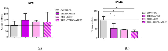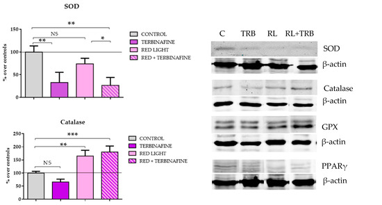 2.4. Expression of Antioxidant Enzymes Superoxide Dismutase (SOD), Catalase, Glutathione Peroxidase (GPX) and PPARγ in HaCat Exposed to Red Light