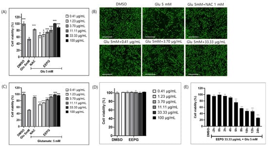 Neuroprotective effect of EEPG and its cell viability result. (A) Image analysis using Calcein AM confirms the neuroprotective effects of EEPG. The treatment between 11.33 μg/mL and 100 μg/mL of EEPG showed more than 80% neuroprotective effect to glutamate-induced cytotoxicity. (B) These cells were stained with Calcein AM. Calcein AM selectively stained live cells. In image analysis, 33.33 μg/mL of EEPG shows potent neuroprotective effects in HT22 cells (Scale bars = 1 mm). (C) Ez-cytox assay reveals that the treatment of EEPG at a concentration range between 3.70 μg/mL and 100 μg/mL showed potent neuroprotective effects in glutamate-induced cytotoxicity. (D) The cytotoxicity of EEPG. EEPG shows no cytotoxicity at 100 μg/mL. (E) The cell survival of HT22 cells for 24 h after incubation of 5 mM of glu. EEPG was added at the indicated times before and after the addition of 5 mM of glu. *** p < 0.001 and * p < 0.02 versus 5 mM glu alone group.