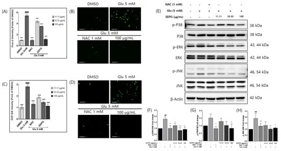 (A) The bar graph shows the effects of EEPG on Ca2+ ion concentration. An amount of 5 mM of glutamate treatment increases cellular Ca2+ ion concentration. Cotreatment of EEPG and glutamate decreases cellular Ca2+ ion concentration. (B) The image of cellular Ca2+ ion. The image was generated using a Flu-3 fluorescent Ca2+ ion sensor. 5 mM glutamate increased fluorescent intensity of Ca2+ ion sensor. Co-treatment with 100 μg/mL EEPG decreased fluorescent intensity of Ca2+ ion sensor. Scale bars = 100 μm. (C) The bar graph shows the inhibitory effect of EEPG on ROS. (D) The image of ROS generated using a DCF-DA fluorescent ROS sensor. 5 mM glutamate increased fluorescent intensity of ROS sensor. Co-treatment with 100 μg/mL EEPG decreased fluorescent intensity of ROS sensor. Scale bars = 100 μm. (E) The expression level of MAPKs. 5 mM glutamate increases p-P38, p-ERK, and p-JNK, but co-treatment of EEPG decreases the level of p-P38, p-ERK, and p-JNK. (F–H) Bar graphs representing the intensity of immunoblot bands, as quantified using Image J software (Version 1.54k). *** p < 0.001, ** p < 0.002, and * p < 0.02 versus 5 mM glu alone group. ## p < 0.01 and ### p < 0.001 versus untreated control group.
