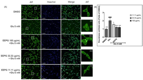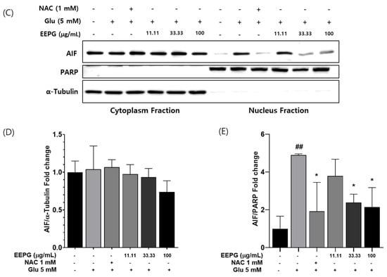 Literature reports indicate that glutamate-induced cell death in HT22 cells exhibits characteristics of both apoptosis and necrosis [,]. Additionally, studies have shown that glutamate neurotoxicity induces apoptosis via an AIF-dependent pathway [,]. We therefore investigated whether EEPG could prevent AIF-mediated apoptosis. Similar to previous reports, glutamate treatment induced the translocation of AIF to the nucleus. Immunohistochemistry with image analysis showed that the accumulation of AIF in the nucleus, as assessed by cell roundness values, decreased with the co-treatment of glutamate and EEPG (Figure 3A,B). Western blot analysis showed an increase in nuclear AIF fraction following glutamate treatment. Conversely, the nuclear fraction of AIF was gradually reduced by co-treatment of EEPG (Figure 3C–E). These data indicate that EEPG treatment inhibits the translocation of AIF to the nucleus from mitochondria in glutamate-induced neuronal cell death.