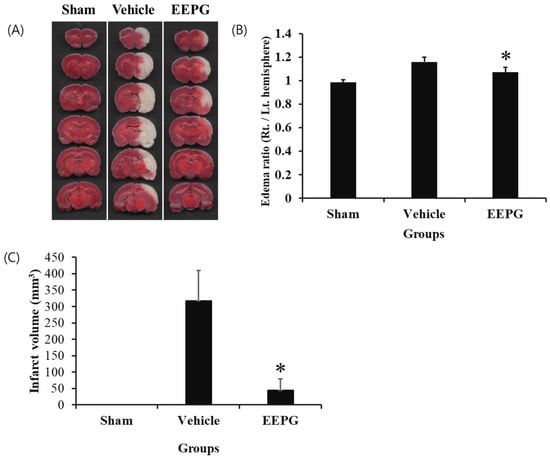 (A) The images of 2,3,5-tetraphenyltetrazolium chloride (TTC) staining of the rat brain slices were obtained from the vehicle and EEPG-treated rats. Sham group; no ischemia induction. Vehicle; ischemia induction. EEPG; 30mg/kg of EEPG was administered, followed by the induction of ischemia. (B) The comparison of rat brain edea ratio. * p < 0.05 (C) Quantification of infarct volumes based on TTC staining. Infarct volume of sham, vehicle, and EEPG treated rats. * p < 0.005.