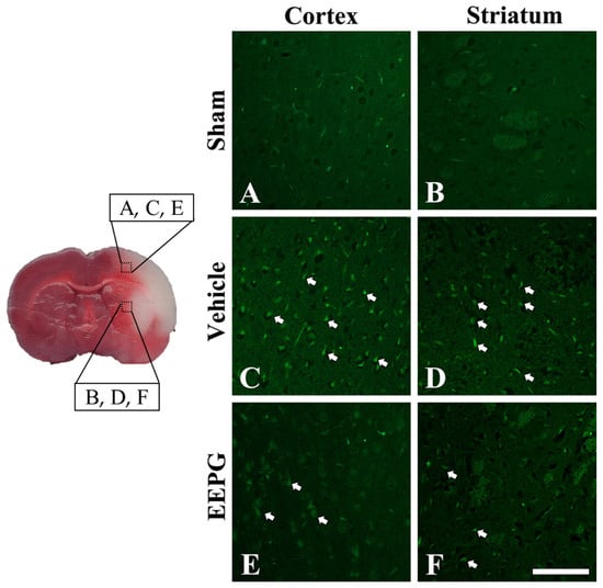 To evaluate the neuroprotective effect against neuronal death due to cerebral infarction, we detected degenerating neurons using FJC staining. The sham group exhibited no fluorescent signal throughout the brain, including the cortex and striatum. In contrast, the Vehicle group displayed a strong fluorescent signal in these regions, indicating significant FJC(+) staining (white arrows in Figure 5), which reflects neuronal cell death following MCAO. Notably, the EEPS group showed reduced FJC(+) staining in the penumbra of the cortex and striatum compared to the Vehicle group, suggesting a neuroprotective effect of EEPS.