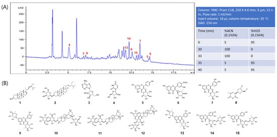 HPLC analyses identified 10 compounds with retention times at 254 nm as follows: 5.1 min (compound 4), 6.84 min (compound 3), 7.07 min (compound 8), 11.83 min (compound 13), 12.24 min (compound 14), 12.59 min (compound 9), 13.11 min (compound 15), 13.52 min (compound 7), 14.58 min (compound 5), and 14.67 min (compound 6) (Figure 6A). The identification was accomplished by analyzing the unknown peak’s absorption spectra and retention data of the extract and comparing them with purified compounds.