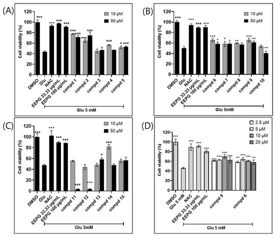 The neuroprotective effects of purified compounds in HT22 cells with glutamate-induced cell death. (A–C) 15 compounds were evaluated for their neuroprotective effects against glutamate-induced neuronal cell death. Compounds (1, 2, 6, 9, and 14) showed neuroprotective effects, whereas other compounds showed weak or no neuroprotective activity in HT22 cells. (D) Among compounds (1, 2, 6, and 9), compounds (6 and 9) were further evaluated for their neuroprotective effects against glutamate-induced neuronal cell death, and both exhibited moderate neuroprotective effects in HT22 cells. *** p < 0.001, ** p < 0.01, * p < 0.1.