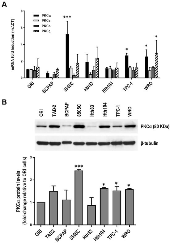 Protein kinase C alpha (PKCα) expression in thyroid cancer (TC) cells. (A) mRNA levels of PKCα, PKCδ, PKCε, and PKCζ were analyzed by qPCR in thyroid cells. Gene expression was normalized to the β2-microglobulin gene using the ΔΔCt method. Data are expressed as the mean S.E. of three independent experiments. * p < 0.05 and *** p < 0.0001 with respect to ORI cells. (B) (Upper panel) PKCα protein levels in ORI and epithelial TC cells as determined by Western blot analysis. β-tubulin was used as the loading control. Similar results were observed in 3 independent experiments. (Bottom panel) Densitometry analysis of PKCα with respect to β-tubulin. * p < 0.05: *** p < 0.0001 with respect to ORI cells.