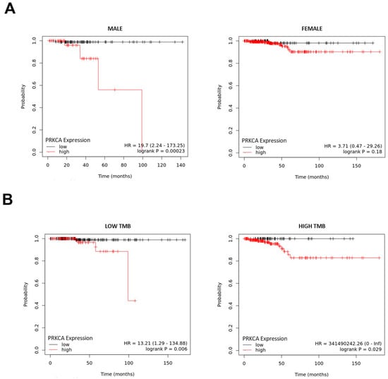 The relationship between protein kinase C alpha (PKCα) expression levels and overall survival in thyroid cancer (TC) patients from a public database. RNA-seq data from the PanCancer Atlas corresponding to TC (TCGA-THCA) were used to analyze for overall survival (OS) through Kaplan–Meier curves. (A) (Left panel). Male TC patients with high expression of PKCα have a reduced OS than those with low expression (p < 0.001). (Right panel). Women TC patients with high expression of PKCα have a reduced OS than those with low expression (ns). (B) (Left panel). Patients with low tumor mutational burden (TMB) and high mRNA expression of PKCα have a reduced OS than those with low expression (p < 0.01). (Right panel). Patients with high TMB and high mRNA expression of PKCα have a reduced OS than those with low expression (p < 0.05). The red curve represents the survival rate of TC patients with high PKCα expression, and the black curve represents the survival rate of TC patients with low PKCα expression.