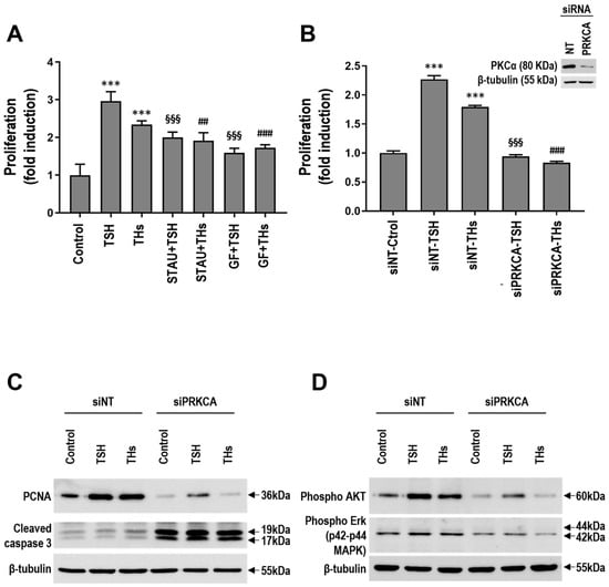Protein kninase C (PKC)-mediated thyroid stimulating hormone (TSH) and thyroid hormones (THs) effects in thyroid cancer thyroid cancer (TC) cells. (A) TPC-1 cells were pretreated or not (Ctrol) with 1 μM staurosporine (STAU) or 5 μM GF109203X (GF) and then incubated with 10 mIU/mL TSH or 1 nM T33,5,3′-triiodo-L-thyronine (T3) and 100 nM L-thyroxine (T4) (physiological concentrations, THs) in combination for 48 h. A Cell Titer Blue assay determined the number of live cells at each dose. Data are shown as the mean ± SD. *** p < 0.0001 with respect to the control; §§§ p < 0.0001 with respect to TSH; and ## p < 0.005 and ### p < 0.0001 with respect to TH-treated cells. (B) TPC-1 cells were transfected with non-target siRNA (siNT) or PKCα siRNA (siPRKCA); the cells were serum starved and untreated (Ctrol) or treated with 10 mIU/mL TSH or 1 nM T3 and 100 nM T4 (physiological concentrations, THs) in combination for 48 h. Cell Titer Blue assay determined the number of live cells at each dose. Data are shown as the mean ± SD. *** p < 0.0001 with respect to the control; §§§ p < 0.0001 with respect to TSH; and ### p < 0.0001 with respect to TH-treated cells. Inset. TPC-1 cells transfected with siNT or siPRKCA probed with a PKCα specific antibody. β-tubulin was used as the loading control. Representative data from 1 of 3 independent experiments. (C) The expression levels of PCNA and cleaved caspase-3 of cells described in B were determined by Western blot analysis. β-tubulin was used as the loading control. Similar results were observed in 3 independent experiments. (D) TPC-1 cells were transfected as in B; the cells were then serum starved and untreated (control) or treated with 10 mIU/mL TSH or 1 nM T3 and 100 nM T4 (THs) for 10 min. Western blot analysis shows AKT and p42/44 MAPK phosphorylation levels. β-tubulin was used as the loading control. Similar results were observed in 3 independent experiments.