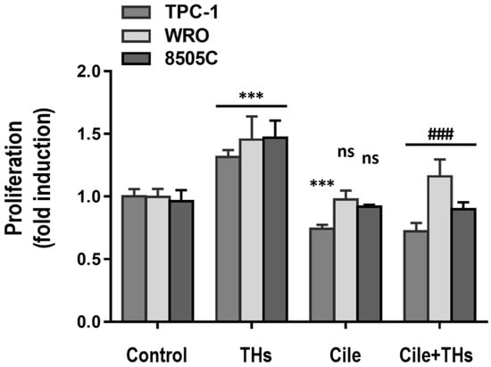 The combined treatment of 3,5,3′-triiodo-L-thyronine (T3) and L-thyroxine (T4) induces the proliferation of thyroid cancer (TC) cells through noncanonical thyroid hormones (THs) receptors. TPC-1, WRO, and 8505C cells were grown in the absence of FBS and then pretreated or not (control) with 4.5 μM Cilengitide (Cile) and then incubated with 1 nM T3 and 100 nM T4 in combination (physiological concentrations, THs) for 48 h by a Cell Titer Blue assay; the number of living cells was determined with each treatment. A commercial kit (Promega) was used as indicated by the manufacturer. The mean ± SD is shown. *** p < 0.0001 with respect to the control and ### p < 0.0001 with respect to THs and ns means not significant differences with respect to control.