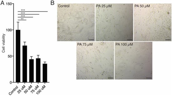 MTS cell viability assay results of different PA treatment. (A) AC16 treated with different PA concentrations (0, 25, 50, 75, 100 μM) for 24 h. (B) Cell morphological changes were assessed after PA treatment for 24 h. ** p < 0.01, *** p < 0.005. Error bars represent SDs. Scale bars = 100 μm. PA. Abbreviations: PA, palmitate.