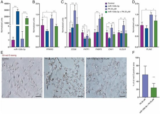 We therefore analyzed the expression levels of the FA transport marker CD36, along with its downstream target genes FATP1, FABP3, CAV1, and VLDLR, as well as the fatty acid storage marker PLIN2. The expression of CD36, FABP3, CAV1, VLDRL and PLIN2 were upregulated in AC16 cells exposed to PA, whereas FATP1 was downregulated. miR-130b-3p transfection significantly reverted the PA-induced expression of CD36, CAV1 and VLDR but not FABP3 (Figure 2C). PLIN2 expression was upregulated with PA and reverted with miR-130b-3p (Figure 2D). Oil Red O staining allows the detection of lipids in cultured cells. We verified the intracellular lipid accumulation in AC16 exposed to PA. However, miR-130b-3p significantly decreases the intracellular lipid content (Figure 2E,F).