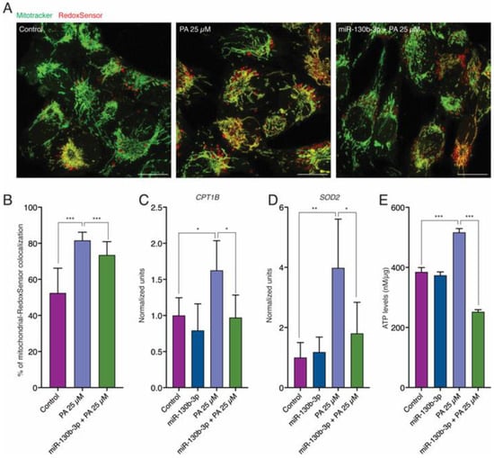To verify the increase in FAO in PA-treated AC16 cells, we analyzed the oxidative stress intensity based on Mito-Tracker Green and Redox-Sensor Red staining. Confocal images showed greater levels of colocalization in AC16 exposed to PA compared to the control (Figure 3A,B). Consistently, qRT-PCR analysis showed that PA upregulated the expression of CPT1b, and mitochondrial superoxide dismutase 2 (SOD2). miR-130b-3p overexpression partially rescued the degree of colocalization of Mito-Tracker Green and Redox-Sensor Red (Figure 3A,B). In addition, miR-130b-3p reverted both CPT1b and SOD2 expression levels (Figure 3C,D). We analyzed the total ATP concentration in PA-treated AC16 cells. A significant increase in ATP production was observed in the presence of PA, reverted when miR-130b-3p was overexpressed (Figure 3E).
