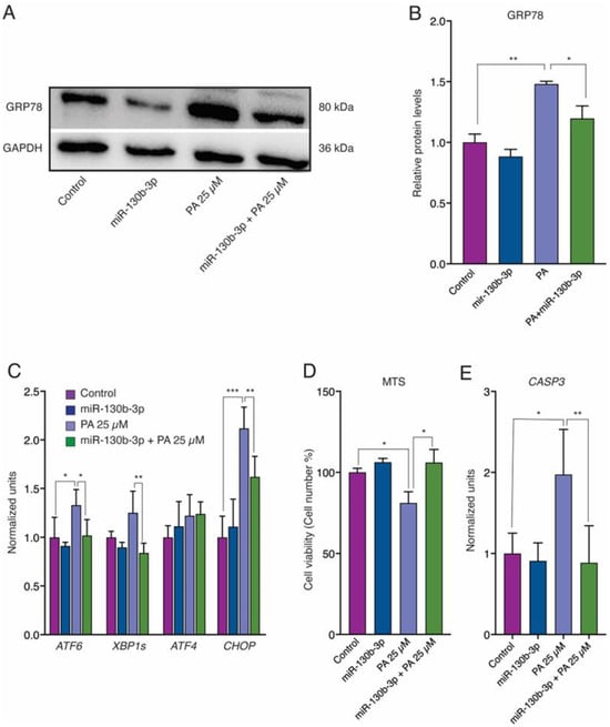 We assessed the cell viability and CASP3 expression and the miR-130b-3p impact on ER stress-induced cardiomyocyte apoptosis. As expected, MTS analysis demonstrated that PA significantly decreased the viability of AC16 cells. In addition, qRT-PCR analysis determined increased expression of CASP3 (Figure 4D,E). However, miR-130b-3p overexpression reversed cell viability and CASP3 expression (Figure 4D,E).