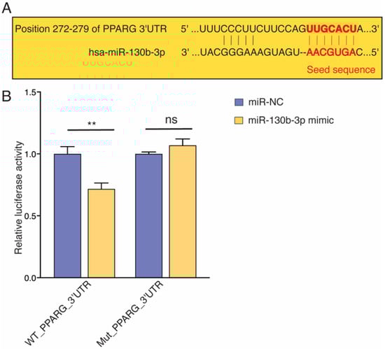 miR-130b-3p targets PPARγ. (A) Predicted miR-130b-3p binding sites in the 3′UTR of PPARγ. (B) Dual-luciferase activity assay in AC16 cells co-transfected with the pMIR-REPORT miRNA expression reporter vector containing the WT or Mut PPARγ 3′UTR fragment with miR-130b-3p mimic or the miRNA mimic NC for 24 h. ** p < 0.01. Error bars represent SDs. Abbreviations: NC, negative control; WT, wild type; Mut, Mutant; ns, non-significant.