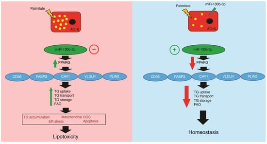 We analyze the role of miR-130b-3p in the lipid metabolism of human cardiomyocytes through PPARγ expression and its downstream target genes, the mitochondrial oxidative stress status, the ER stress response and the apoptosis induced by PA. We report a critical involvement of miR-130b-3p against lipotoxicity in AC16 cells via regulating PPARγ (Figure 6).