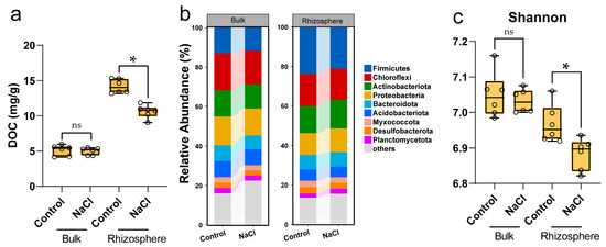 Different soil DOC levels affect bacterial abundance and α-diversity. (a) Soil (DOC) dissolved organic carbon level of WT plants under control or saline conditions; (b) telative abundance of bacterial phyla (a) and alpha diversity analyses, as well as Shannon (c) in rhizosphere and bulk bacteria of WT rice plants. One-way ANOVA; *: p ≤ 0.05; ns: p > 0.05.