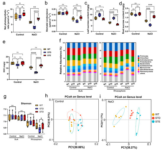 Rhizosphere bacterial community response to different carbon allocation and deposition conditions. Net photosynthetic rate (a), stomatal conductance (b), leaf sucrose content (c), root sucrose content (d), and soil dissolved organic carbon (DOC, (e)) of WT, STD, and STE under control or NaCl treatment. Relative abundance of bacterial phyla (f) and alpha diversity analysis as well as Shannon (g) in rhizosphere and bulk bacteria of STD or STE rice plants. The principal coordinate analysis (PCoA) shows microbial community dissimilarity (Bray−Curtis distance) among rhizosphere samples from the three different sucrose transporting circumstances under control ((h), R2 = 0.6329, p = 0.001) or salt stress ((i), R2 = 0.6883, p = 0.001). One-way ANOVA; *: p ≤ 0.05; **: p ≤ 0.01; ***: p ≤ 0.001; ****: p ≤ 0.0001; ns: p > 0.05.