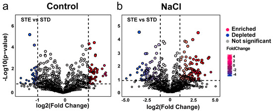 Carbon deposition conditions affect bacterial enrichments. Volcano plots show enrichment and depletion patterns in rhizosphere microbes between STD and STE under control (a) or NaCl treatments (b).