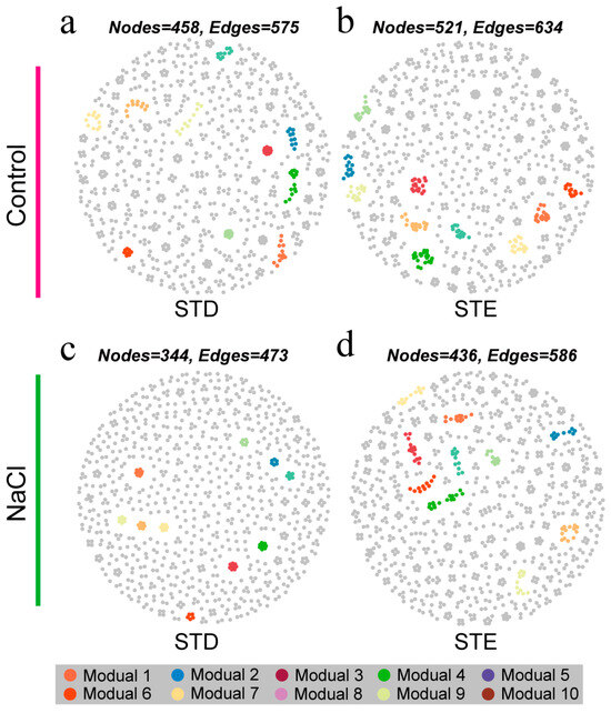 The co-occurrence network analysis revealed distinct bacterial interactions [28]. Reduced nodes were found in the rhizosphere (344–521) (Figure 5), in contrast to 529–850 nodes in the bulk soil (Figure S6). Meanwhile, there were fewer connections (edges) in the rhizosphere network (Figure 5). Distorted sucrose transport plants showed fewer nodes and connections and were further reduced under NaCl treatment (Figure 5a,c). Although saline treatment also reduced the network patterns of STE, it remained at a higher level compared to STD (Figure 5b,d). In addition, the rhizosphere network of STE had a stronger correlation compared to STD (Table S6).