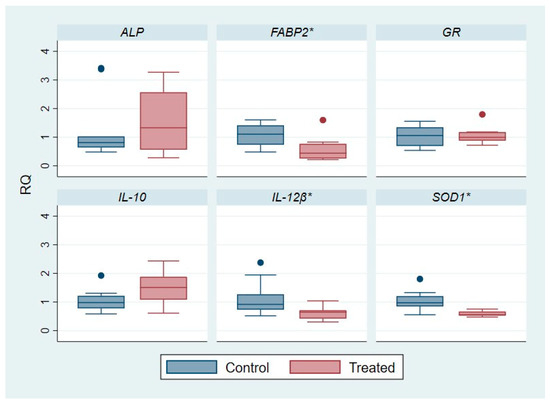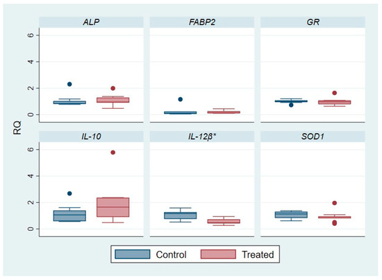 The effect of diet integrated with polyphenols on gene expression level (DGE) among control and treated group in fish livers. β-actin vas used as a housekeeping gene for normalization. RQ: relative quantification in comparative RTqPCR assay. ALP: alkaline-phospatase; FABP2: fatty acid binding protein 2; GR: glutathione reductase; IL-10: interleukin-10; IL-12β: interleukin-12 subunit β; SOD1: superoxide-dismutase. Dots: extreme values. *: p-value < 0.05.