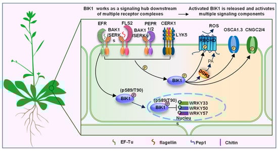 A series of studies of BIK1 have further demonstrated its important roles in plant immunity. BIK1 protein is required for immune signaling mediated by multiple PRRs, such as FLS2, EFR, PEPR1/2, BAK1, CERK1, and LYK5 (Figure 1) [22,24,25,28,36,37]. Upon PAMPs perception, BIK1 is phosphorylated and released from the PRR complex, leading to the phosphorylation and activation of multiple membrane components, such as the NADPH oxidase RESPIRATORY BURST OXIDASE HOMOLOG D (RbohD), which catalyzes the production of reactive oxygen species (ROS), the Ca2+-permeable channel OSCA1.3, two CYCLIC NUCLEOTIDE-GATED CHANNEL (CNGC) proteins, CNGC2 and CNGC4, both of which result in cytosolic calcium influx, and the DIACYLGLYCEROL KINASE 5 (DGK5) which mediate the phosphorylation of diacylglycerol (DAG), leading to phosphatidic acid (PA) burst [22,25,26,28,38,39,40,41,42]. In addition to the plasma membrane (PM) localization through N-myristoylation, BIK1 also localizes to the nucleus to phosphorylate transcription factors WRKY33, WRKY50, and WRKY57, which function in jasmonic acid (JA) and SA regulation, and the phosphorylation of these WRKYs is impaired while BIK1 is phosphorylated at S89/T90 residues by EFR [29]. However, how BIK1 is released from PM and translocated to the nucleus is yet unclear. Furthermore, BIK1 is directly targeted by some bacterial effector proteins, such as the cysteine protease Pseudomonas phaseolicola B (AvrPphB), which cleaves BIK1, and the Xanthomonas campestris effector AvrAC, which adds uridine 5′-monophosphate to BIK1 for reducing its kinase activity, also indicating the key roles of BIK1 in immune signaling [28,43]. Therefore, it seems that BIK1 serves as a ‘signaling hub’ to connect the PRR complex and the downstream components, thereby transmitting the PAMP signaling to intracellular signaling and inducing distinct defenses (Figure 1). As such, both the BIK1 protein stability and activation must be tightly regulated to prevent plant autoimmunity and ensure proper responses to pathogens.