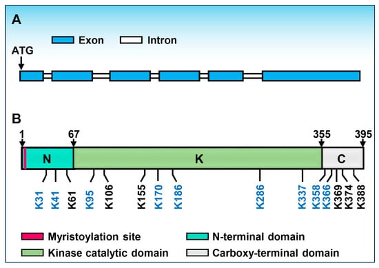 BOTRYTIS-INDUCED KINASE 1 (BIK1) is one of the RLCK-VII subfamily members [27,28]. In Arabidopsis, BIK1 and other closely RLCKs work as central regulators between multiple receptor complexes and downstream signaling components (Figure 1) [22,23,24,25,26,27,28,29,30,31,32]. The BIK1 gene is initially identified to be significantly induced during Botrytis cinerea (Botrytis) infection using an Arabidopsis microarray, thus named BOTRYTIS-INDUCED KINASE 1 (BIK1) [23]. There are six exons and five introns in the BIK1 genomic region (Figure 2A). In agreement with most RLCKs, the coding DNA sequence (CDS) of BIK1 encodes a ser/thr protein kinase, which contains a plant consensus N-myristoylation motif and a kinase catalytic domain (Figure 2B) [23]. In addition, loss of function of the BIK1 gene leads to severe susceptibility to necrotrophic fungal pathogens Botrytis and Alternaria brassicicola (A. brassicicola), but enhances the resistance to the bacterial pathogen Pseudomonas syringae pv. tomato (Pst) DC3000, which may be due to the increased salicylic acid (SA) accumulation in the bik1 mutant [23]. With or without Botrytis infection, the level of SA is all higher than wildtype, suggesting that BIK1 acts as a negative regulator of SA accumulation. Moreover, BIK1 is required for normal plant growth and development as well. For example, bik1 mutant plants exhibit early flowering, reduced fertility, shorter primary roots, longer and more root hairs and lateral roots, and the leaves of bik1 have serrated margins and wrinkled surfaces compared to wild-type plants, respectively [23]. Subsequently, it is also confirmed that BIK1 functions in ethylene (ET) signaling. Flg22, ACC, and pathogen-induced expression of BIK1 is dependent on EIN3, which is one of the master transcription factors in the ethylene signaling pathway, and bik1 mutant plants display altered expression of ET-regulated genes [33]. Additionally, BIK1 negatively regulates BR signaling. The bik1 mutant plants are hypersensitive to brassinosteroids (BR) compared to wild-type plants. Furthermore, upon BR treatment, a leucine-rich repeat (LRR)-receptor kinase BRASSINOSTEROID INSENSITIVE 1 (BRI1), which recognizes the polyhydroxylated growth hormone BR, associates with and phosporylates BIK1, thereby leading to the release of BIK1 from the BRI1 receptor [34]. Recently, BIK1 is reported to interact with and phosphorylate SNF1-related protein kinase 2.6 (SnRK2.6) and controls multiple osmotic stress responses [35].