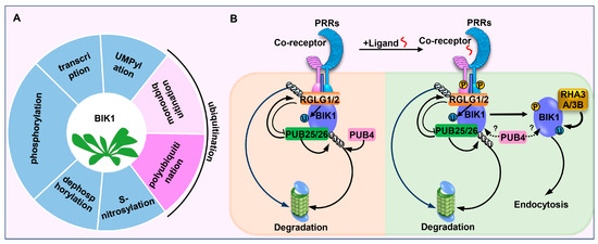 BIK1 protein is regulated by multiple mechanisms, such as transcription, phosphorylation, de-phosphorylation, S-nitrosylation, UMPylation, and ubiquitination, or the interplay between them (Figure 3A and Table 1) [33,43,53,54,55,56,57,58,59,60,61,62,63]. Among them, ubiquitination is one of the most abundant types of protein post-translational modification in plant immunity, and multiple studies have demonstrated the key roles of ubiquitination in regulating BIK1 homeostasis. In this review, we aim to summarize and discuss the functions of the differential ubiquitination of BIK1 mediated by seven ubiquitin ligases in PAMP-triggered immune responses. In addition, these advances not only demonstrate that the differential modifications on BIK1 by ubiquitin hold a crucial position in plant immunity but also provide a good example for future research in the insight into the understanding of ubiquitin-mediated modifications in plants.
