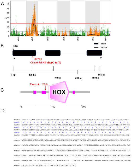 MutMap analysis and gene structure analysis of CsWOX4. (A) The distribution of the G-index in 7 chromosomes. The horizontal axis represents the name and length of each chromosome, the vertical axis represents the G-index value, and the red line represents the threshold line corresponding to 95%. (B) Gene structure of CsWOX4. Black boxes represent exons and black lines represent introns. (C) Predicted protein domain of CsWOX4. (D) Coding sequence and amino acid sequence alignment of CsWOX4. Black represents the complete sequence information of CsWOX4, blue represents the amino acids expressed by the mutant cswox4, and * represents the stop codon of cswox4.
