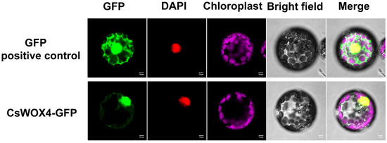 To verify the expression site of CsWOX4, the Golden Gate method was used to construct a CsWOX4 and GFP protein fusion expression vector. The protoplasts of N. benthamiana seedlings were extracted, and the CsWOX4–GFP protein fusion expression vector plasmid, nuclear marker and cytoplasmic marker were transformed into tobacco protoplasts. Fluorescence confocal microscopy demonstrated that the green fluorescence signal of GFP completely overlapped with the red fluorescence of the nuclear marker, indicating that the CsWOX4–GFP protein was localized in the nucleus. In addition, weak green fluorescence was observed in the cytoplasm, indicating that CsWOX4–GFP was also expressed in small amounts in the cytoplasm (Figure 3).