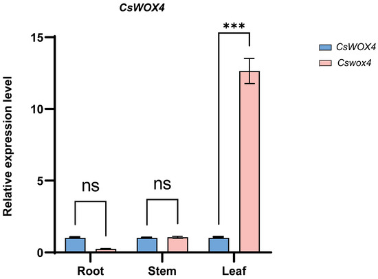 Expression profiles of CsWOX4 gene in different tissue types of J128 and K39 mutants detected by qPCR. Values shown are mean ± SD calculated from three biological and three technical replicates. Statistical significance is denoted as *** for p < 0.001 as determined by Student’s t-test.