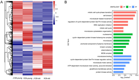 Transcriptome data analysis of J128 and K39. (A) Differential expression display of “J128” and K39 genomics. (B) Differential gene GO annotation analysis.