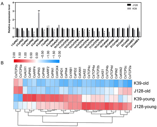 We performed an RNA-seq analysis of the J128 WT and K39 mutant leaves to comprehensively analyze the possible mechanisms of action in mutant plant development from the perspective of gene expression. Notably, 2703 significantly differentially expressed genes were identified between the J128 WT and K39 mutant samples, and GO enrichment analysis revealed their enrichment in metabolic processes, with transcriptional regulation being the most significant. The GO annotation pathways of differentially expressed genes were closely related to hormone regulation, especially auxin, in the cell cycle and transcription processes. Auxins can participate in various processes, such as plant growth and development, cell division and elongation, embryogenesis and apical dominance [21]. Auxin transport pathways in plants are manifested in two ways. One is short-distance transport, which relies on transport proteins such as AUX/LAX, PIN and ABCB/PGP in phloem cells and vascular tissue, and the other is long-distance transportation, which relies on chemical permeation and transpiration in the phloem [22]. The auxin efflux carrier (PIN), auxin influx carrier (AUX/LAX) and ABCB/PGP participate in the polar transport of auxin, which contributes to the differences in the auxin concentration and generation of the maximum auxin concentration in the region [23,24]. The PIN family is the most extensively studied efflux carrier family in plants [25,26], whereas PIN1 is the most extensively studied member of the PIN protein family. PIN1 is localized on the cell membranes of stem apical meristematic tissue, xylem thin-walled cells and vascular bundle cells [27,28]. The PIN2 protein is involved in root growth in response to gravity [29], whereas the PIN3 protein is involved in gravity growth, phototaxis growth and the lateral transport of auxin [30]. PIN4 is involved in auxin transport in the root tip quiescent center [31]. In this study, the RNA-seq results revealed the significant differential expression of CsPIN3. PIN5 is responsible for transporting auxin from the cytoplasm to the endoplasmic reticulum lumen [32]. PIN7 regulates root gravity growth [33]. Members of the AUX/LAX family act as carriers of auxin influx and participate in establishing auxin concentration gradients in different tissue types and organs [34]. Research on the impact of PINOID (PID) on plant development shows that it acts as a protein kinase and plays a positive regulatory role in auxin polarity transport by phosphorylating PIN proteins and controlling PIN polarity localization [35]. OsPID regulates the polar transport of auxin during rice development, and its overexpression leads to the delayed formation of adventitious roots, curled stem growth and phototaxis loss in rice [36]. CsPID participates in ovules by regulating the polar transport of auxin [37]. Functional research on the TCP family has primarily focused on lateral branch development, leaf formation and flower symmetry in plants [38].