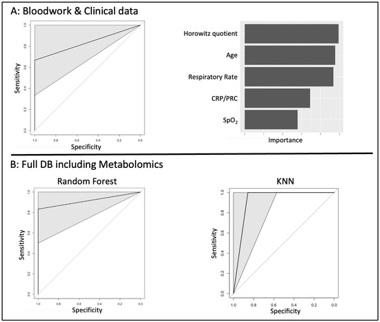 COVID-19 severity predictive algorithm performance. Several machine learning classifiers were used to attempt to build a predictive algorithm for COVID-19 severity 8 days after the onset of symptoms, using two different datasets. Representative ROC curves and main contributing variables are shown. (A) Performance and contributive variables of the Random Forest model built from the database containing bloodwork and clinical data only. (B) Performance and contributive variables of the Random Forest model built from the dataset containing bloodwork, clinical data and metabolomics screening. ROC curves including 95% confidence intervals were drawn using the pROC package and a bootstrapping strategy.