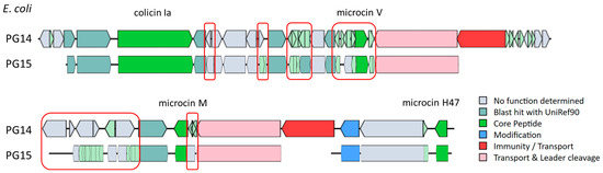 Alignment of the bacteriocin gene clusters (BGC) from E. coli PG14 and E. coli PG15 isolates, which encode identical bacteriocins as performed using BAGELv.4.0. ORFs are represented by arrows and those with a predicted function are indicated by gene identity and/or color. Red squares highlight regions where gene rearrangements have been identified.