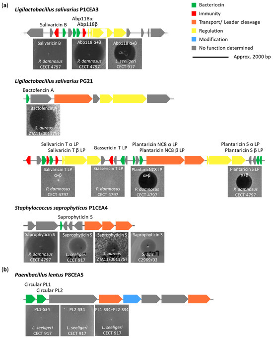 (a). Bacteriocin gene cluster (BGC) and antimicrobial activity assessed by the spot-on-agar test (SOAT) of IV-CFPS-produced class II bacteriocins from L. salivarius P1CEA3, L. salivarius PG21, and S. saprophyticus P1CEA4 against different indicator strains. (b). BGC and antimicrobial activity evaluated by the spot-on-agar test (SOAT) of IV-CFPS/SIML-produced putative class I circular bacteriocins PL1 and PL2, encoded by P. lentus P8CEA5, against different indicator strains. ORFs are represented by arrows and those with a predicted function are indicated by gene identity and/or color.